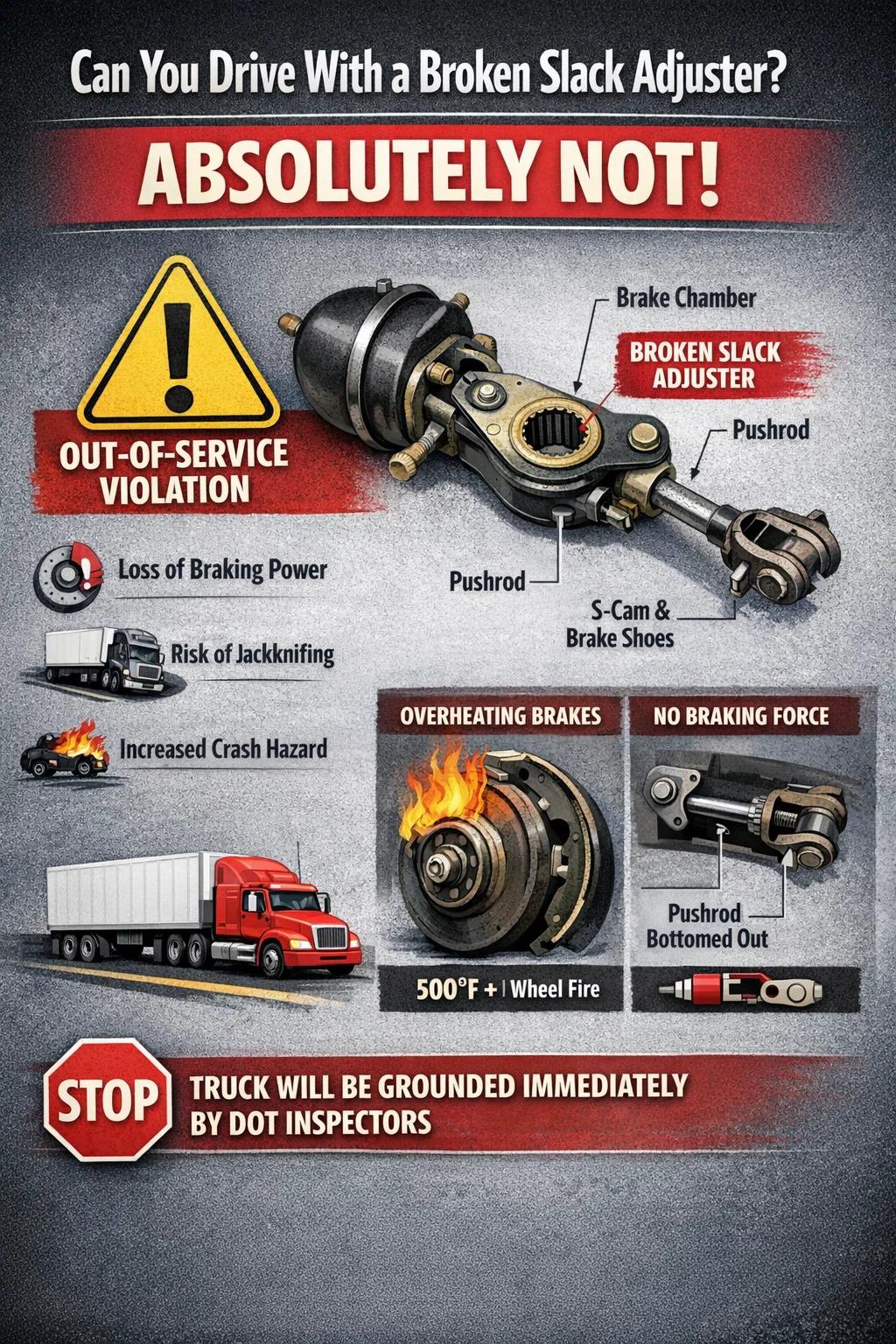 Kısa cevap: kesinlikle hayır. Kırık, arızalı veya yanlış ayarlanmış fren ayarlayıcısıyla ticari bir aracı yasal veya güvenli bir şekilde kullanamazsınız. Ulaştırma Bakanlığı'nın (DOT) ve güvenlik müfettişlerinin gözünde, kırık bir gevşeklik ayarlayıcı "hizmet dışı" ihlalidir. Bu kusura sahip bir aracı kullanırken yakalanırsanız, kamyonunuz muayene alanında derhal topraklanacaktır.