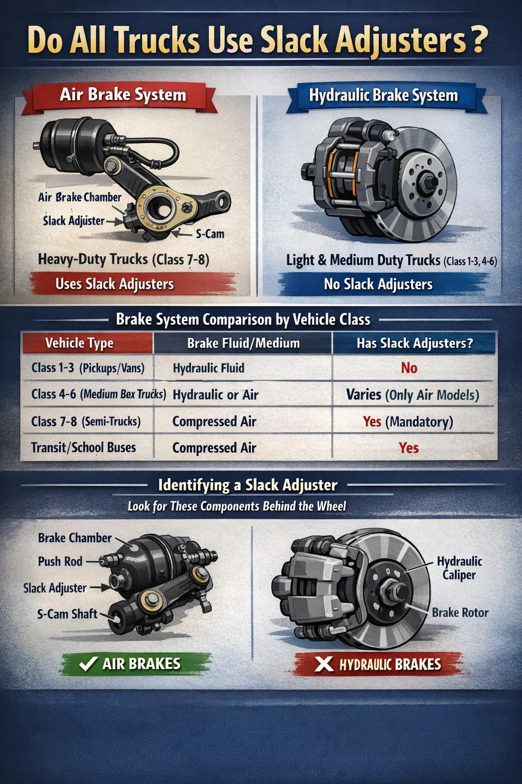 Hayır, tüm kamyonlarda gevşeklik ayarlayıcıları yoktur. Bir kamyonun bu bileşenlerle donatılmış olup olmadığı tamamen fren sistemine bağlıdır. Özellikle, gevşek ayarlayıcılar ağır ticari araçlarda (Sınıf 7 ve Sınıf 8 kamyonlar) bulunan havalı fren sistemlerinin temel bir parçasıdır. Standart pikaplar (Sınıf 1-3) gibi hafif hizmet kamyonları ve birçok orta hizmet kapalı kasa kamyon, fren pabucu veya balata açıklığını korumak için gevşeklik ayarlayıcı mekanizma kullanmayan hidrolik fren sistemleri kullanır.