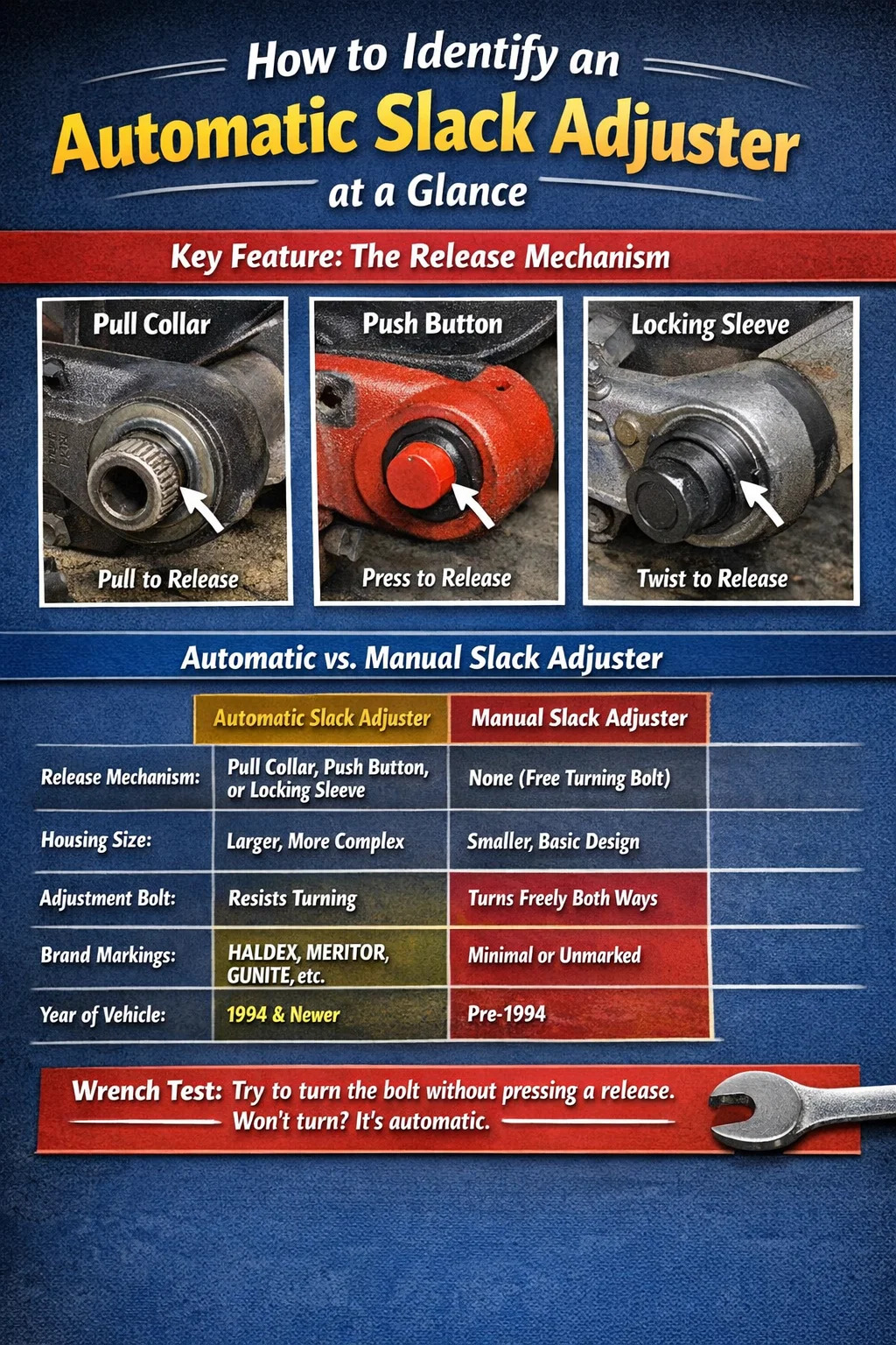 Otomatik bir gevşeklik ayarlayıcı şu şekilde tanımlanabilir: ayarlayıcı gövdesinde bir serbest bırakma mekanizmasının varlığı - sonsuz dişli ayar cıvatasının yanında bulunan çekme tipi bir bilezik, bir basma düğmesi veya bir kilitleme manşonu. Bu serbest bırakma özelliği, otomatik gevşeklik ayarlayıcıyı (birSbir) manuel olandan ayıran en güvenilir görsel göstergedir. Manuel ayarlayıcıda altıgen cıvata, kilitleme mekanizması olmadan her iki yönde serbestçe döner. Otomatik ayarlayıcıda aynı cıvata, normal fren işlemi sırasında kazara geri çekilmeyi önleyen bir kavrama veya mandal sistemi tarafından korunur.