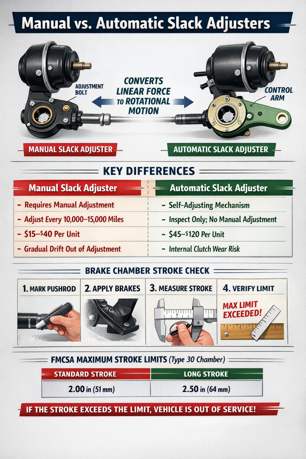 FMCSA düzenlemeleri uyarınca Kuzey Amerika'da yasal olarak gerekli olan maksimum fren körüğü stroku, fren odası boyutuna göre tanımlanır - Tip 30 fren odası için bu sınır 2 inçtir (51 mm). Bunu aştığınızda araç hizmet dışı bırakılır. Ayarı bozuk, tutukluk yapan veya aşınmış bir gevşeklik ayarlayıcı, ticari kamyonların Seviye I yol kenarı denetimlerinde başarısız olmasının en yaygın nedenlerinden biridir.