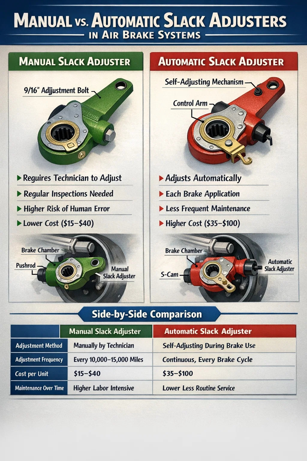 Amerika Birleşik Devletleri'nde endüstrinin manuel fren ayarlayıcılarından uzaklaşması, öncelikle fren ayarının ağır kamyon kazalarına katkıda bulunan başlıca faktörlerden biri olduğunu gösteren verilerden kaynaklandı. 1980'lerin sonlarında ve 1990'ların başlarında yapılan araştırmalar, yol kenarında denetlenen kamyonların önemli bir yüzdesinde en az bir fren ayarının bozuk olduğunu ve bunun başlıca nedeninin hatalı manuel ayarlayıcı bakımı olduğunu ortaya çıkardı.